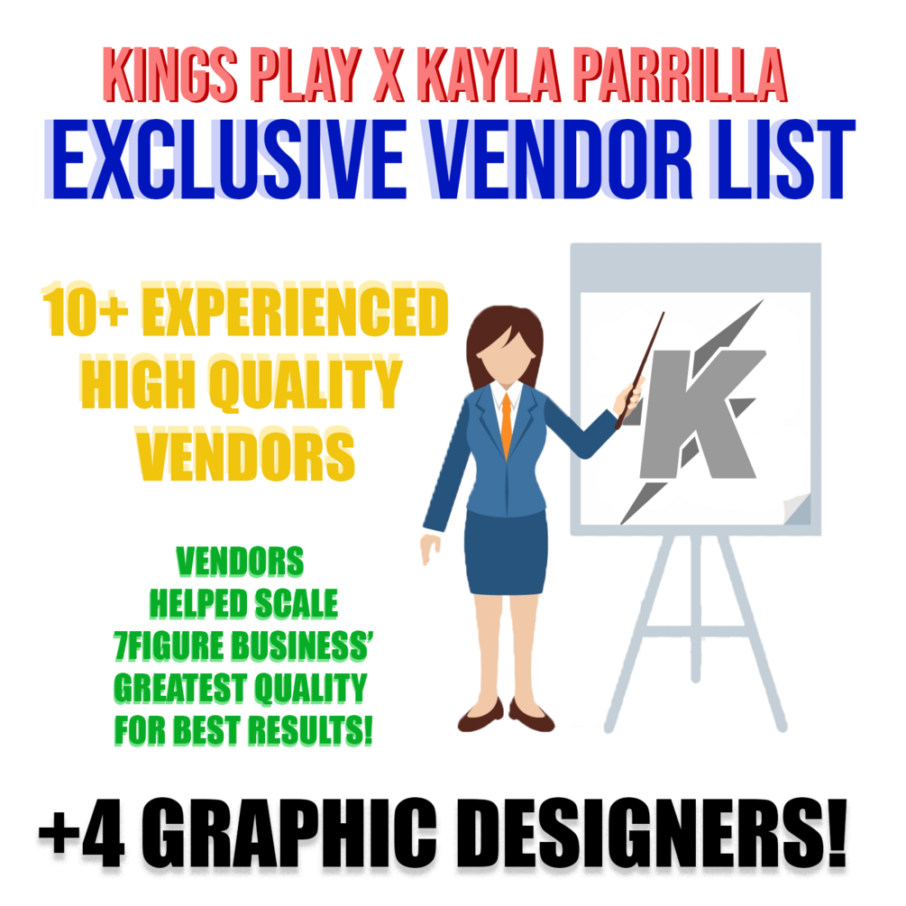High Quality Vendor List from Kayla Parrilla, the owner of KingsPlay. This is a list that contains 10 Exclusive HIGH Quality Trusted Vendors + 6 Graphic Designers that I work with and use for KingsPlay, & experienced myself during my highest moments of my success journey that helped me provide great products which scaled me & my business partners brands to 7 figures. This list is coming from a business owner herself who never had the luxury of being able to buy a vendor list and save myself so much time from looking for vendors and getting scammed along the way. You see the quality, you see the brand it speaks for itself, invest in yourself.